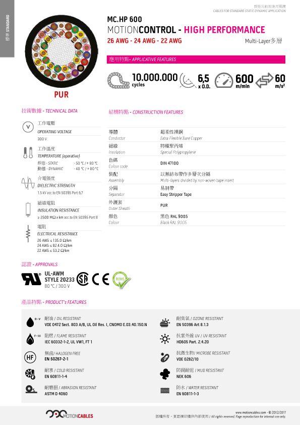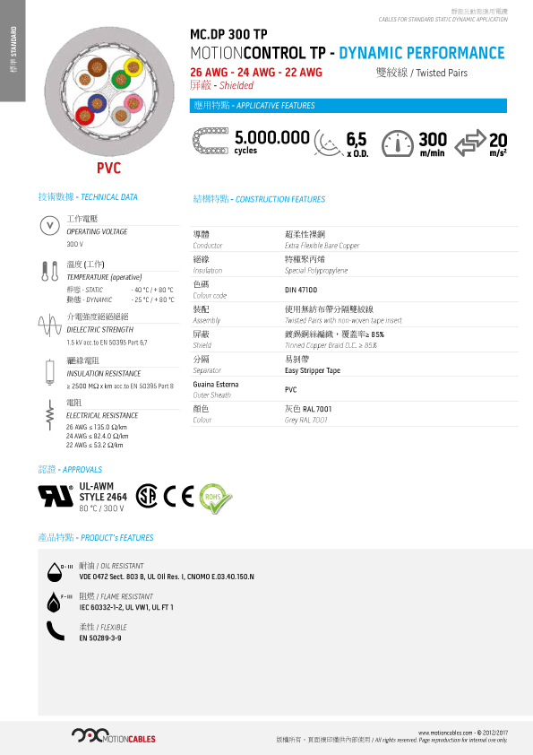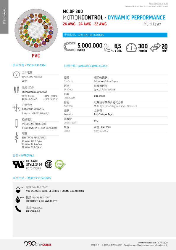 控制電纜 MOTIONCONTROL 300 V – 80 °C | MC.DP 300 | 無屏蔽 Unshielded | 多芯信號電纜 Multicore signal cables22 AWG, 24 AWG, 26 AWG 0.14mm²-0.25mm²-0.34mm² | 請點我 | ||||