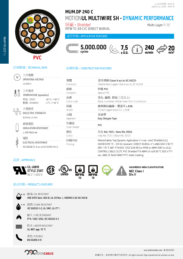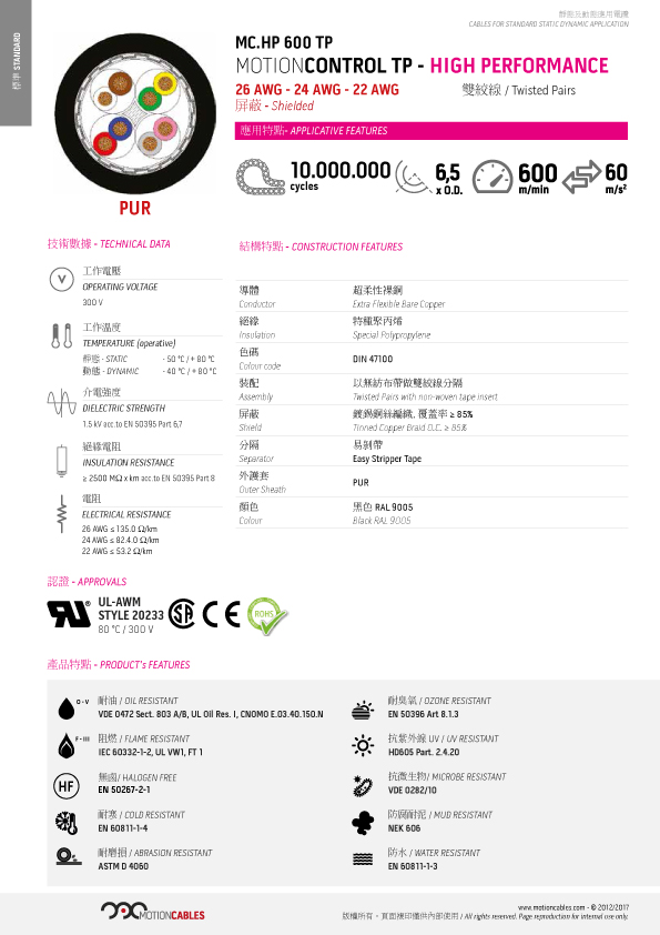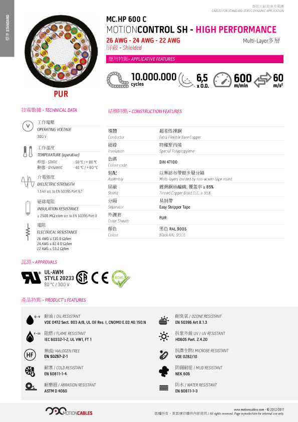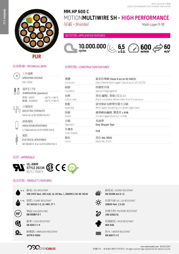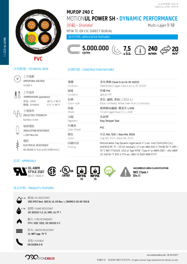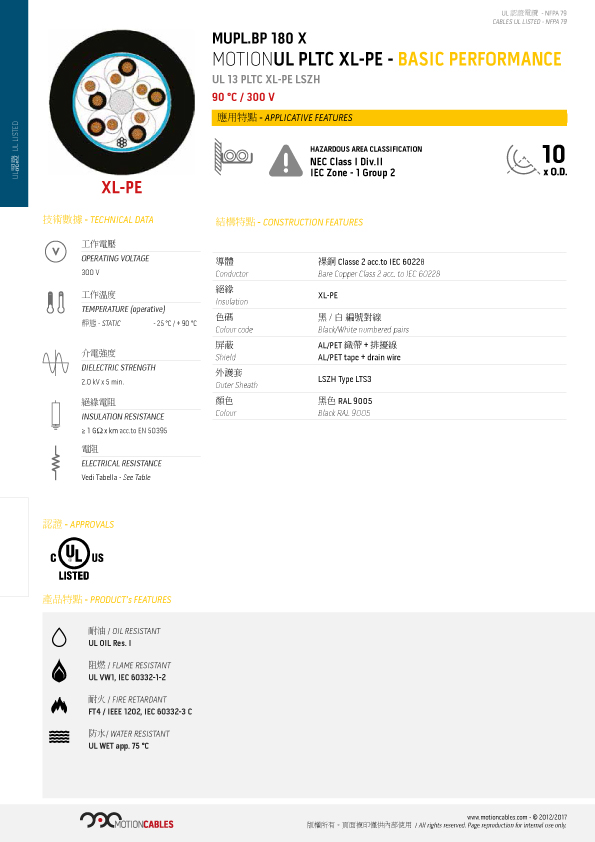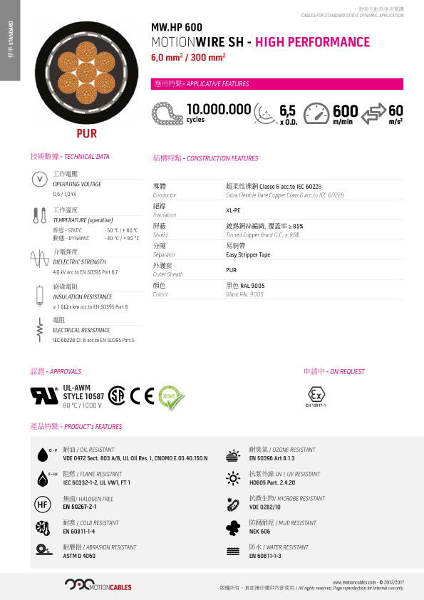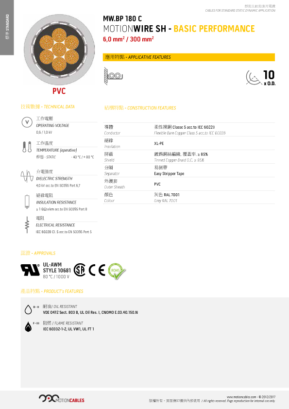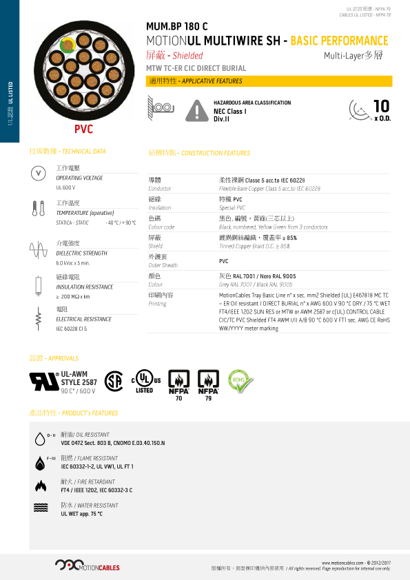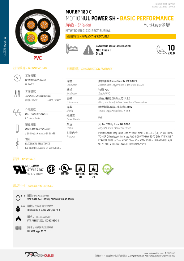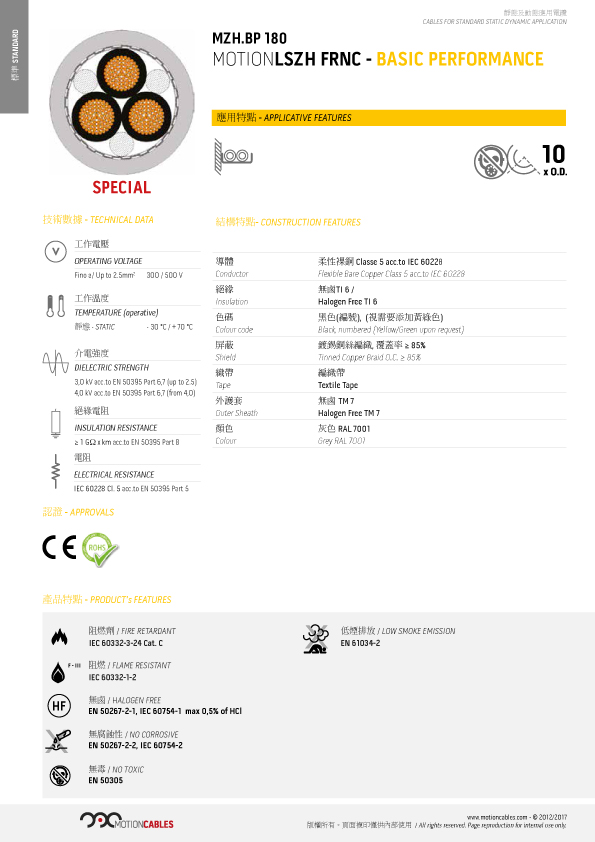 無鹵電纜 MOTIONLSZH | MZH.BP 180 | 屏蔽 Shielded | 無鹵電力電纜- LSZH FRNC Halogen Free power cables – LS0H FNRC | 請點我 | ||||