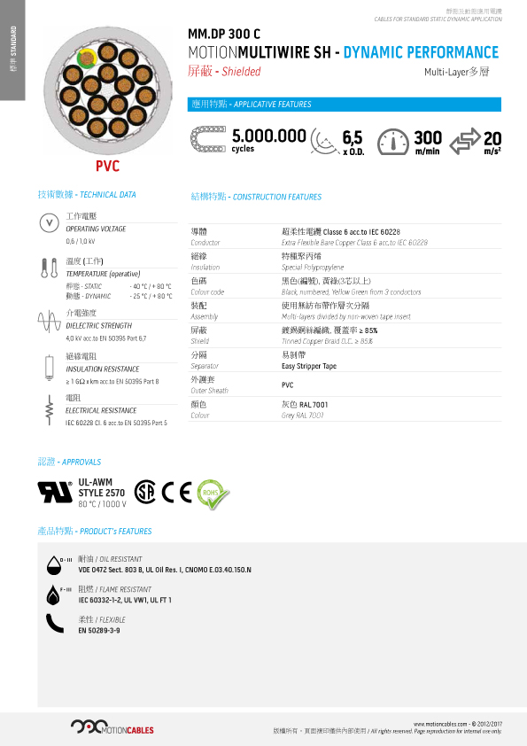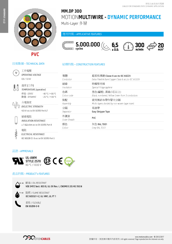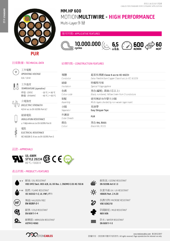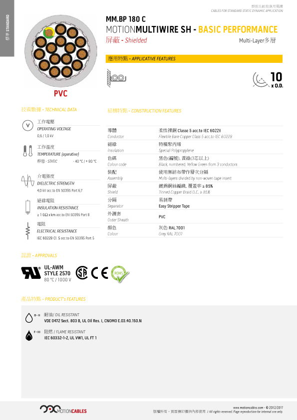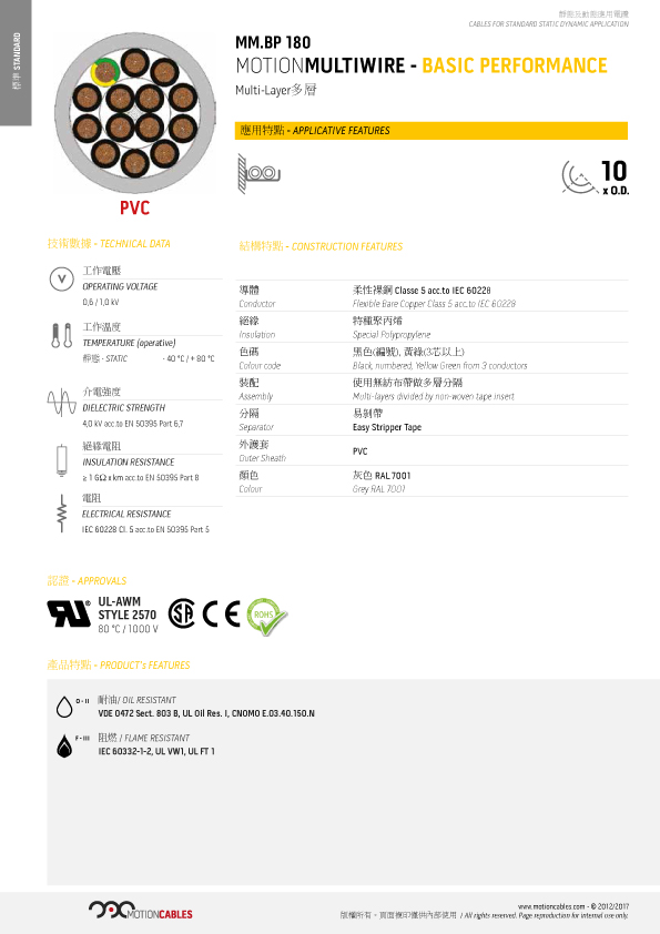 多芯電纜 MOTIONMULTIWIRE 0.6 / 1.0 kV – 80 °C | MM.BP 180 | 無屏蔽 Unshielded | 多芯控制電纜 Multi core control cables0.50mm²-0.75mm²-1.0mm²-1.50mm²-2.50mm² | 請點我 | ||||
