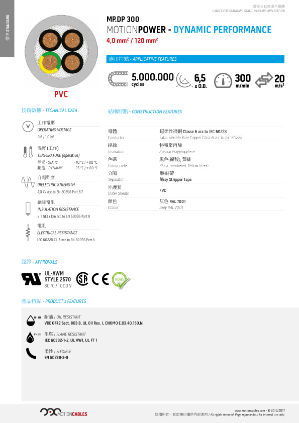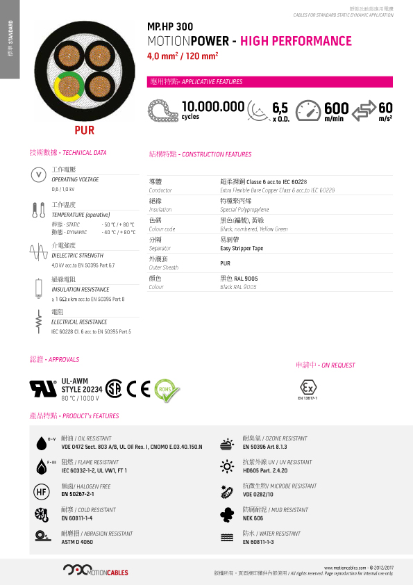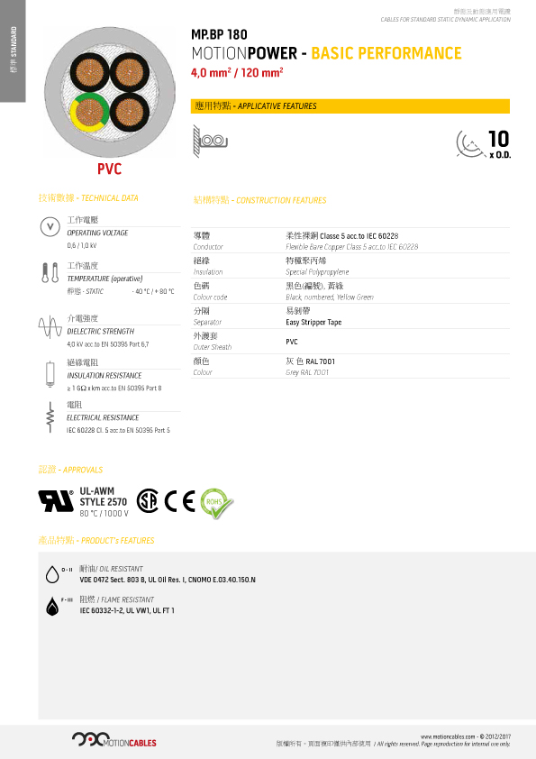 電力電纜 MOTIONPOWER 0.6 / 1.0 kV – 80 °C | MP.BP 180 | 無屏蔽 Unshielded | 電力電纜3 + T Power cables 3 + T4.0mm²/120mm² | 請點我 | ||||