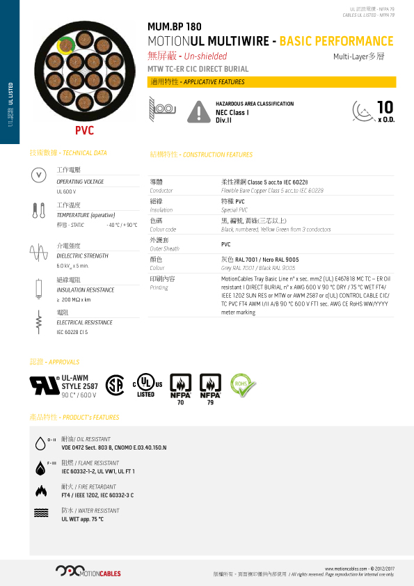 UL多芯電纜 MOTIONUL MULTIWIRE 600 V – 90 °C | MUM.BP 180 | 無屏蔽 Unshielded | 多芯控制電纜 Multi core control cables1.0mm²-1.50mm²-2.50mm² MTW TC-ER CIC DIRECT BURIAL | 請點我 | ||||