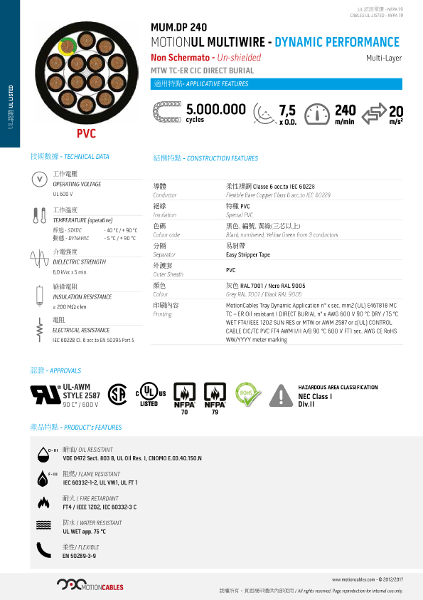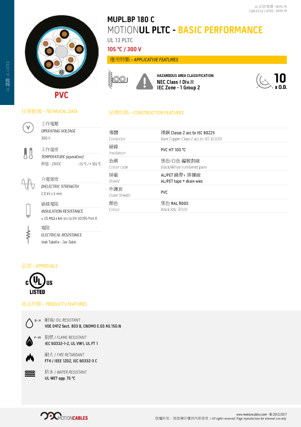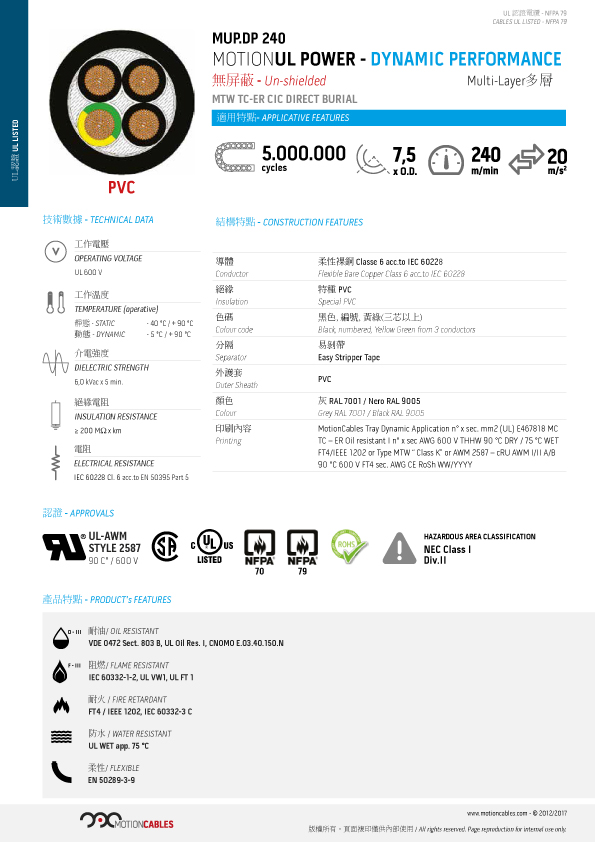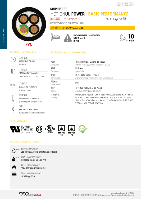 UL電力電纜 MOTIONUL POWER 600 V – 90 °C | MUP.BP 180 | 無屏蔽 Unshielded | 電力電纜3 + T Power cables 3 + T 4.0mm²/120mm² MTW TC-ER CIC DIRECT BURIAL | 請點我 | ||||
