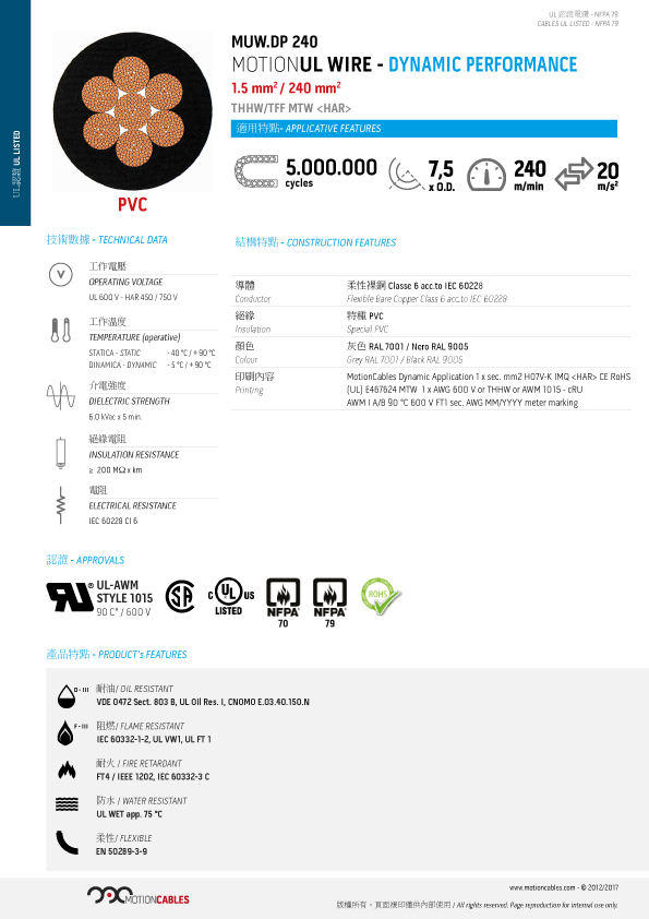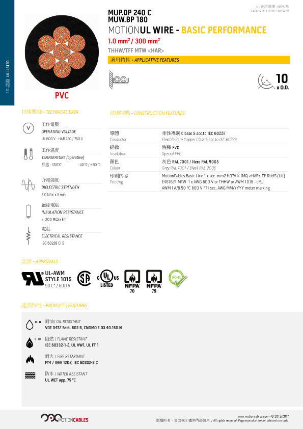 UL單芯電纜 MOTIONUL WIRE 600 V – 90 °C | MUW.BP 180 | 無屏蔽 Unshielded | 單芯電力電纜 Single core power cables6.0mm²/300mm² THHW/TFF MTW <HAR> | 請點我 | ||||