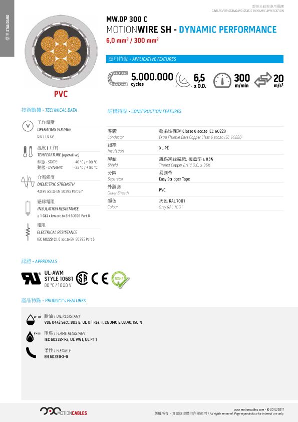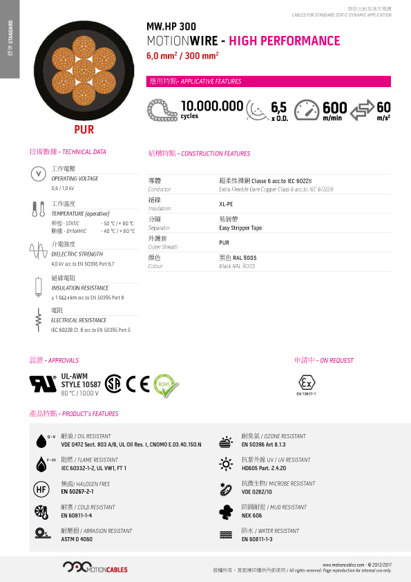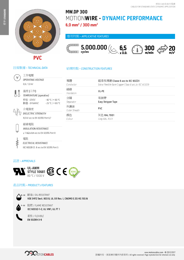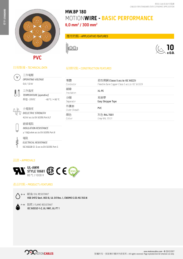 單芯電纜 MOTIONWIRE 0.6 / 1.0 kV – 80 °C | MW.BP 180 | 無屏蔽 Unshielded | 單芯電力電纜 Single core power cables6.0mm²/300mm² | 請點我 | ||||